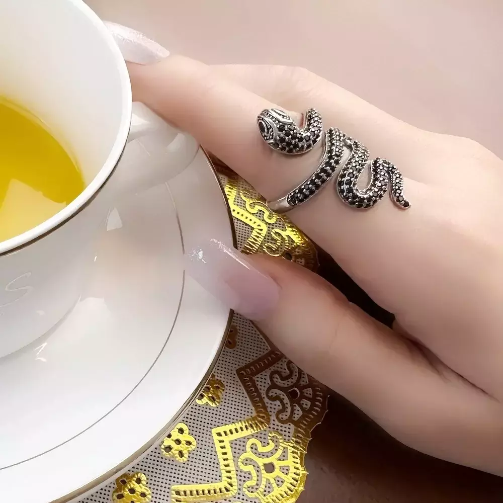 Adquira agora o Anel Cobra Preta Banhado em Prata e adicione um toque de ousadia e estilo ao seu visual!