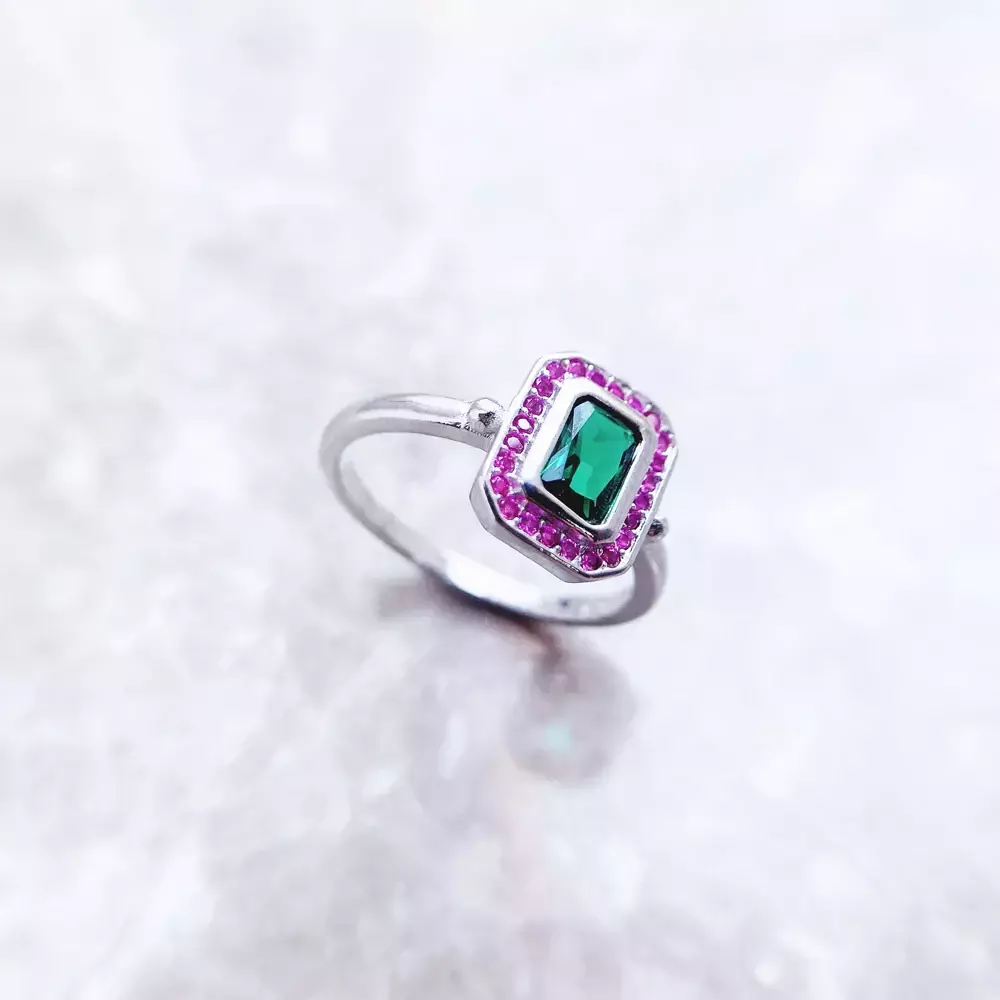 Adquira agora o Anel Pedra Verde e Pedrinhas Vermelhas Banhado em Prata e adicione um toque de cor e elegância ao seu estilo!