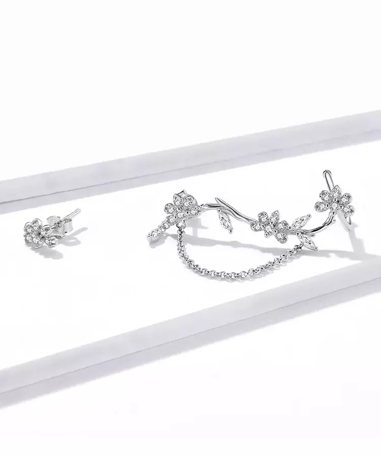 O Brinco Ear Cuff Florear em Prata 925 é uma peça única e moderna, perfeita para quem busca um toque de originalidade e elegância. Este conjunto diferenciado apresenta dois brincos distintos: um lado exibe uma delicada florzinha, enquanto o outro lado é um brinco ear cuff com uma corrente charmosa, ambos com um design floral encantador.