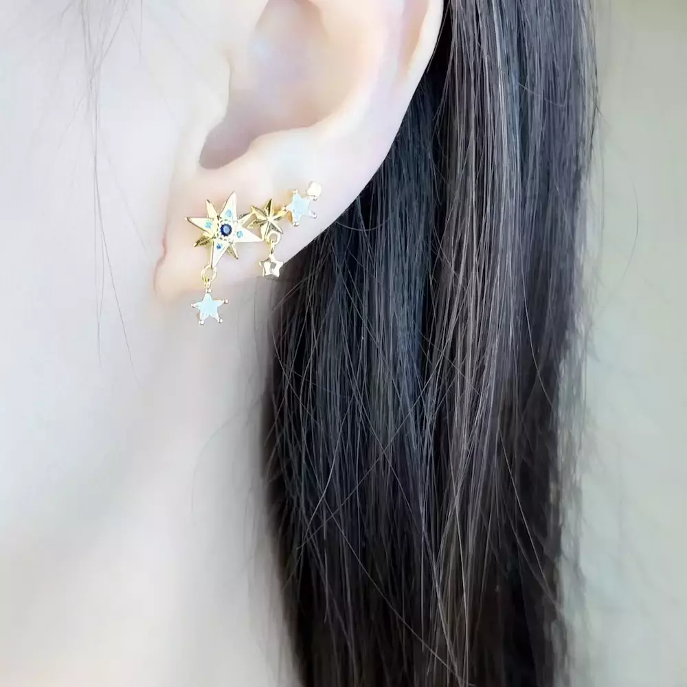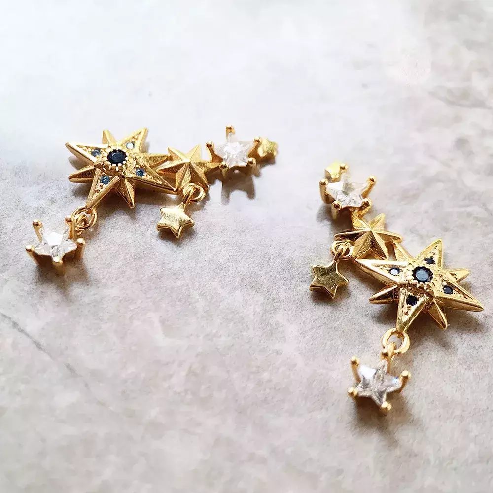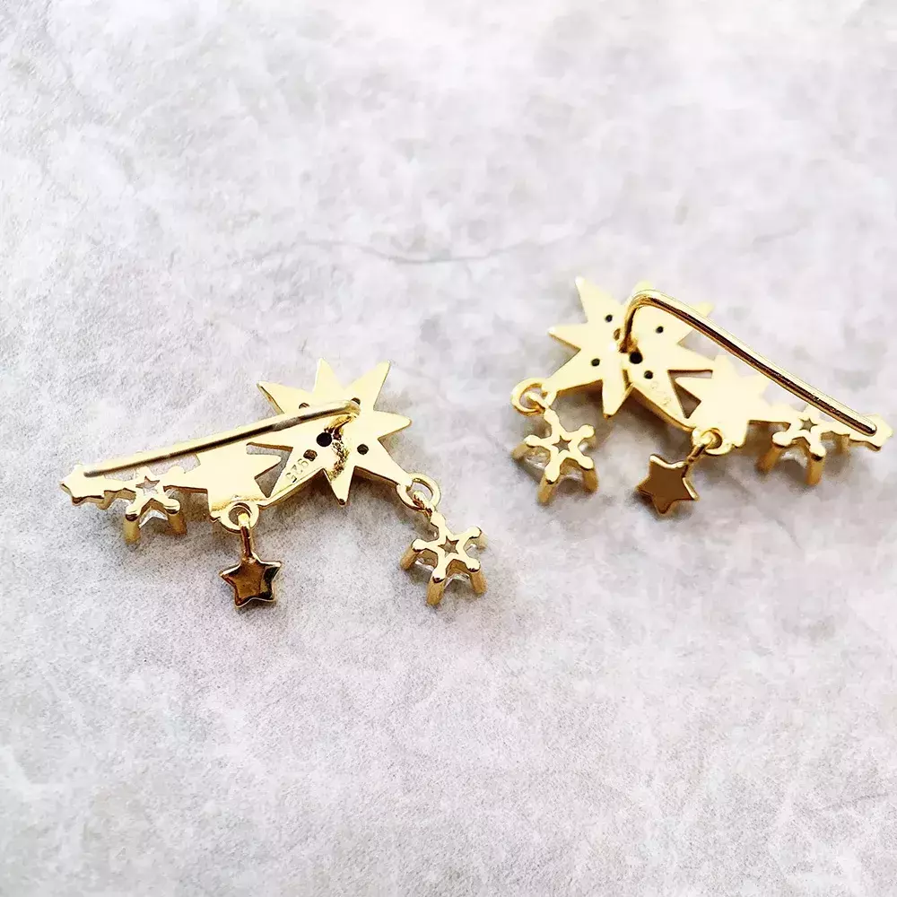 Adquira agora os Brincos Mar de Estrelas Douradas Banhado em Prata e leve consigo a beleza do universo em cada detalhe.